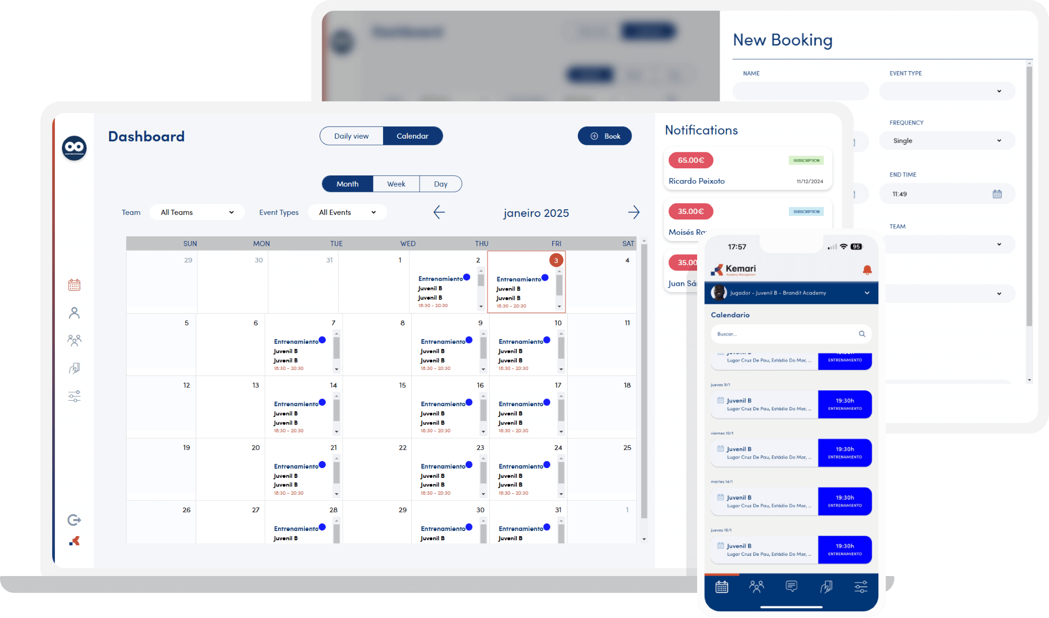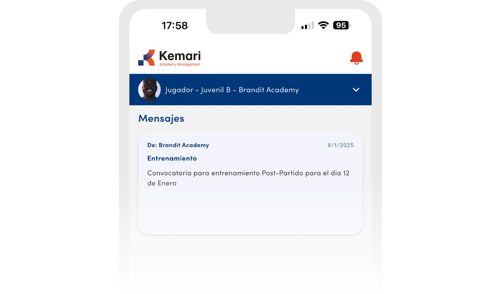 Nunca gestionar todos los aspectos del club había sido tan fácil. La mejor herramienta de gestión de clubes deportivos del mercado. Una solución todo-en-uno que simplifica la gestión del club con funciones para administración de equipos, programación, comunicación y control financiero, accesible desde cualquier dispositivo: ordenador, tablet o smartphone. Con Kemari tendrás control total sobre tus equipos y miembros de tu club de una manera rápida y sencilla. Da de alta tus usuarios, añade o modifica datos, y mantén tus plantillas unificadas con toda la información al alcance de tu mano. Simplifica la gestión de tus instalaciones con el calendario Kemari. Verás de forma detallada los horarios y la distribución de los campos e instalaciones. Podrás hacer las modificaciones que sean necesarias en función de la disponibilidad. Se les notificará a los deportistas cualquier cambio que se haga en sus horarios o lugar de entrenamiento. Todos los miembros del club tendrán constancia de los horarios de cada equipo. Comunícate de una forma sencilla y directa con los miembros de tu club. Envía notificaciones a los usuarios o miembros del staff de forma individual o grupal. Con Kemari podrás emitir cobros a tus usuarios de una manera rápida y automatizada para mejorar la planificación económica del club. Tendrás un control total sobre la situación de cobros y pagos de una manera visual e intuitiva. Tanto para el deportista como para el propio club podrán ver los pagos efectuados y los pagos pendientes para tener un total control sobre los mismos, pudiendo los miembros realizar los pagos directamente desde la aplicación. Conectate desde el dispositivo que sea más cómodo para realizar gestiones o consultar las novedades de tu equipo. Gestiona de manera eficaz tu club deportivo.